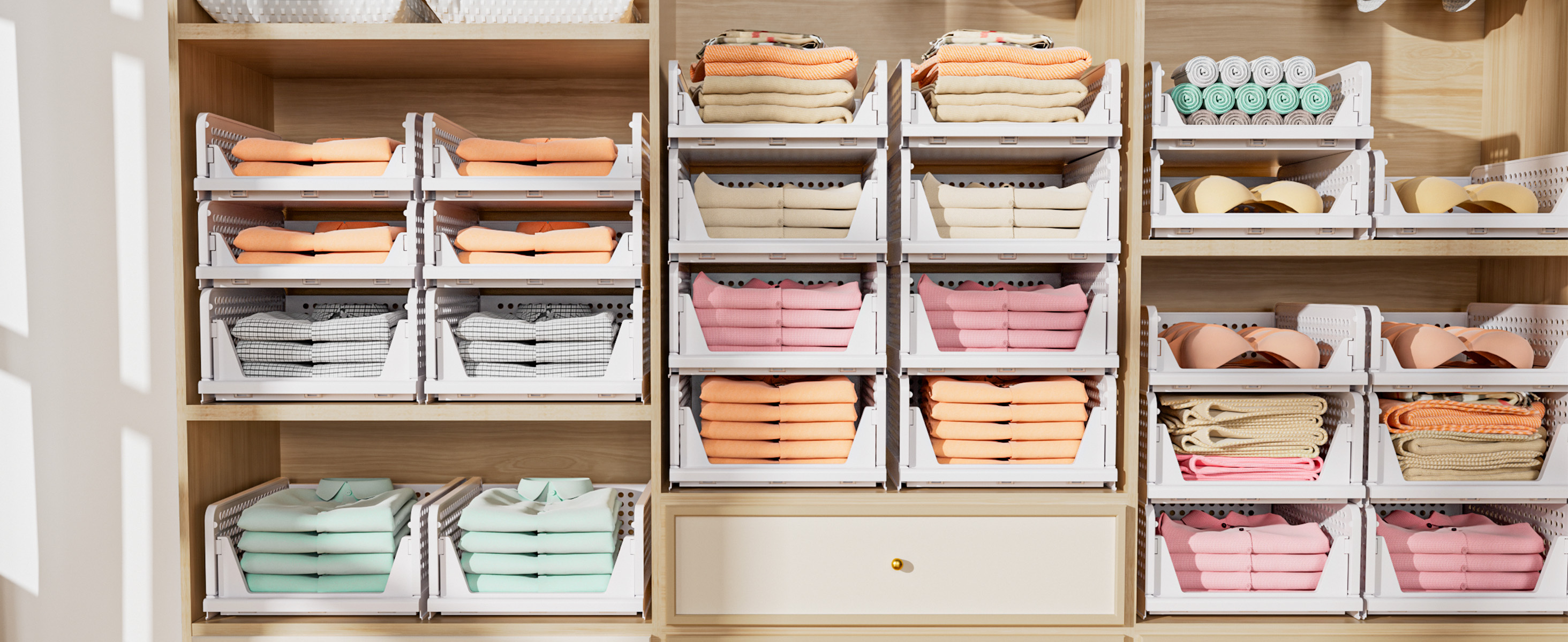 TidyIsles - Wardrobe Storage Organiser - 5 Pack Folding Closet Organisers, Stackable Storage Boxes, Plastic Drawer Organiser Basket for Bedroom Kitchen Bathroom White
